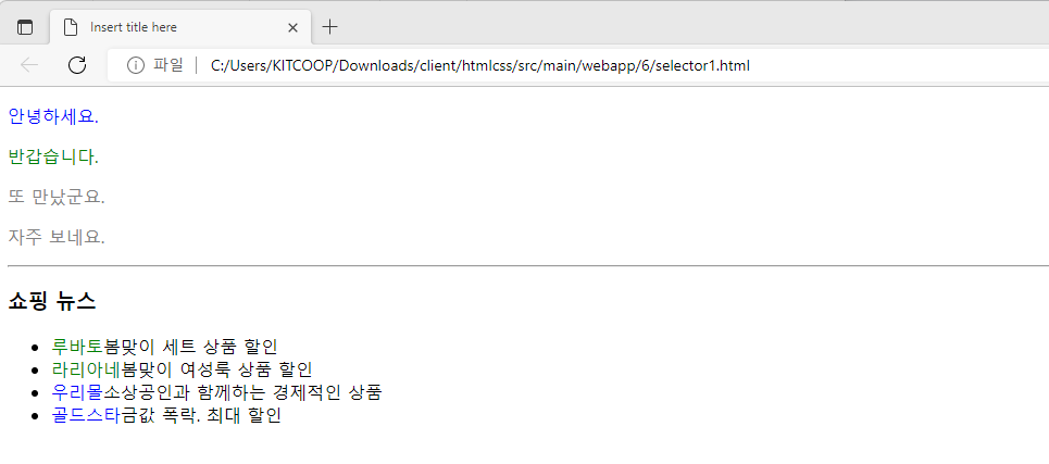 클래스 선택자 : 두군데 이상의 특정 영역 지정하여 동일한 CSS 적용