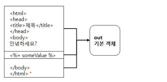 - JSP 페이지가 생성하는 모든 내용은 out 기본 객체를 통해서 전송.