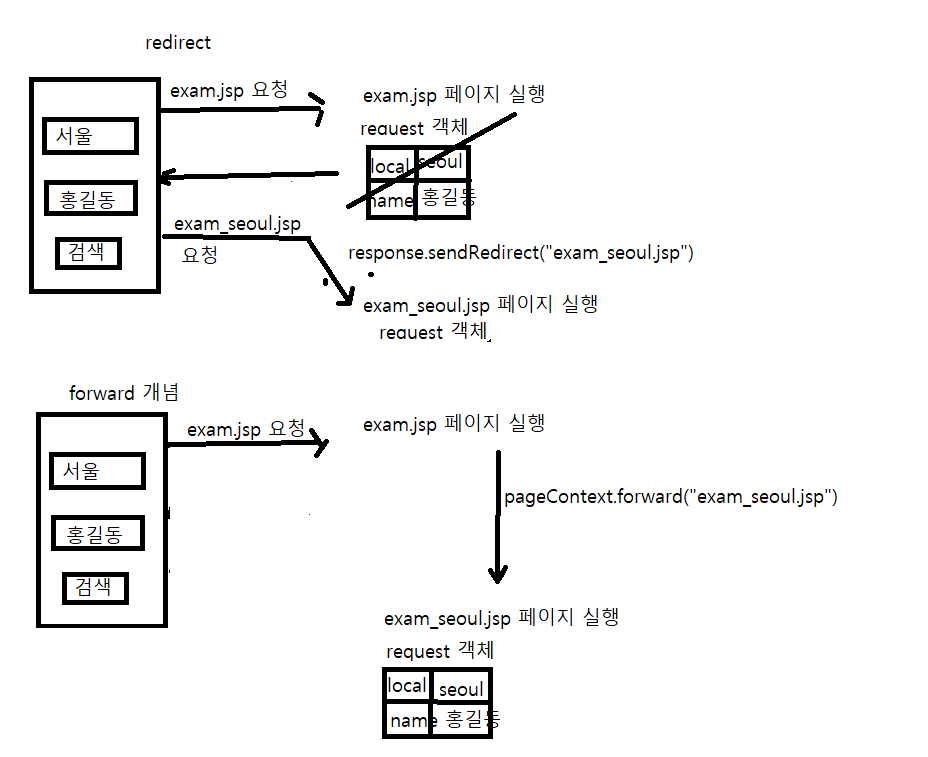 - redirect: 브라우저가 요청. redirect 되는 jsp 페이지도 request 객체 할당