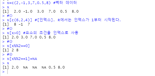 x=c(2,-1,3,7,0.5,8) #벡터 데이터