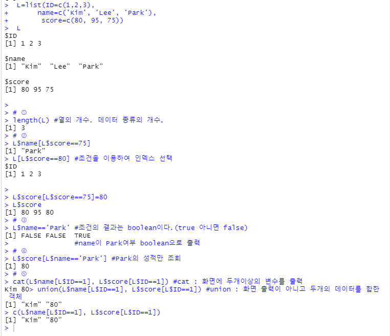cat(L$name[L$ID==1], L$score[L$ID==1]) #cat : 화면에 두개이상의 변수를 출력