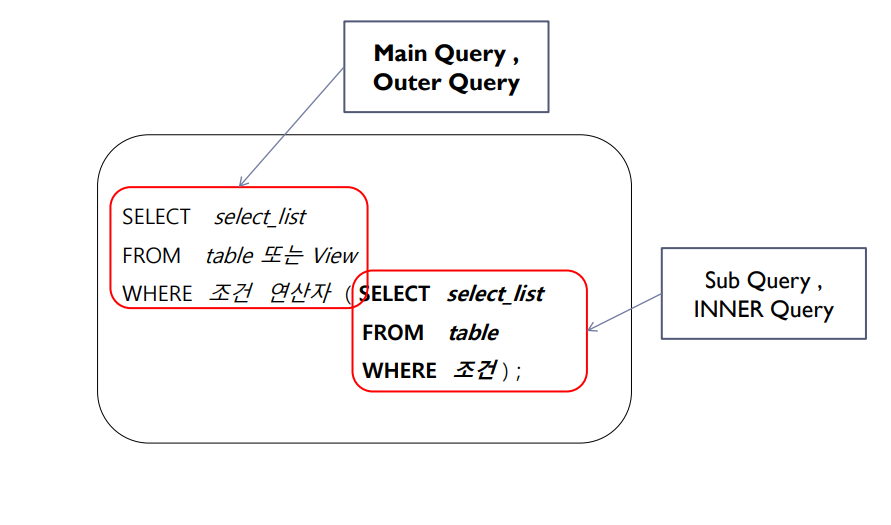 - Sub Query부분은 Where 절에 연산자 오른쪽에 위치해야 하며 반드시 괄호로 묶어야 한다.