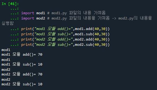 print("mod1 모듈 add()=",mod1.add(40,30))