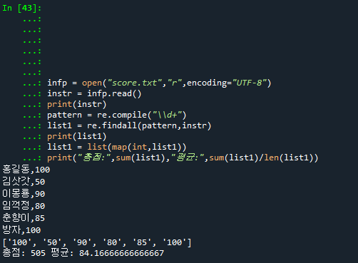 # 문제 : score.txt 파일을 읽어서 점수의 총점과 평균 구하기