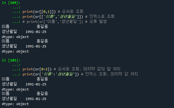 print(sr['이름':'생년월일']) # 인덱스 조회. 마지막 값 까지