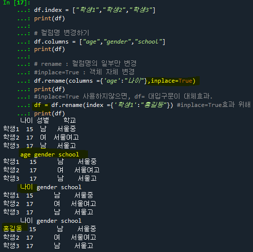 df = df.rename(index ={'학생1':"홍길동"})#inplace=True효과 위해 df = 붙여 다시 저장