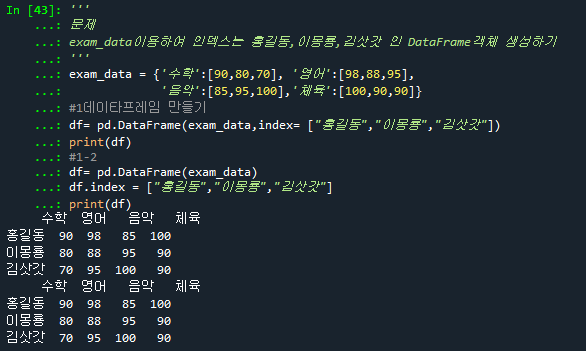 exam_data이용하여 인덱스는 홍길동,이몽룡,김삿갓 인 DataFrame객체 생성하기