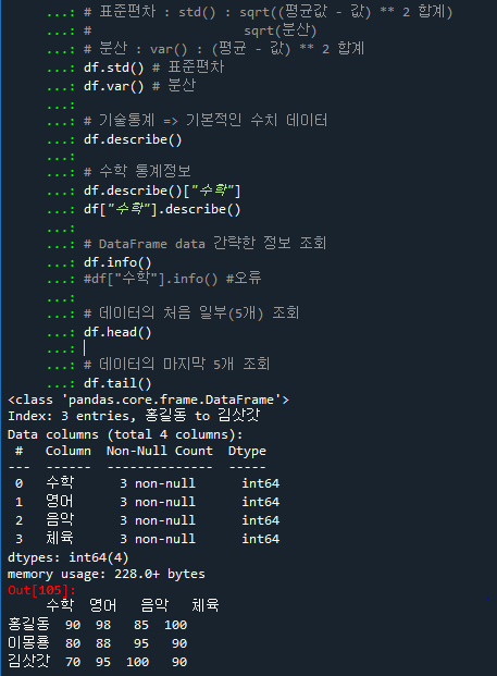 print("표준편차:",df.loc["김삿갓"].std()) # 표준편차