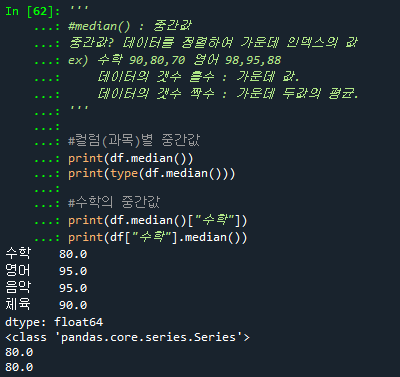 print("중간값:",df.loc["김삿갓"].median()) # 중간값