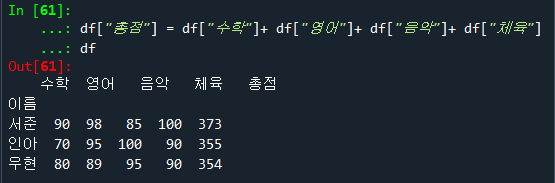 df["총점"] = df["수학"]+df["영어"]+df["음악"]+df["체육"]