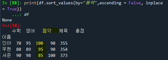 print(df.sort_values(by="음악",ascending = False, inplace = True))