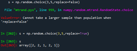 s = np.random.choice(3,5,replace=False) # 오류. 중복이 되어야 한다.