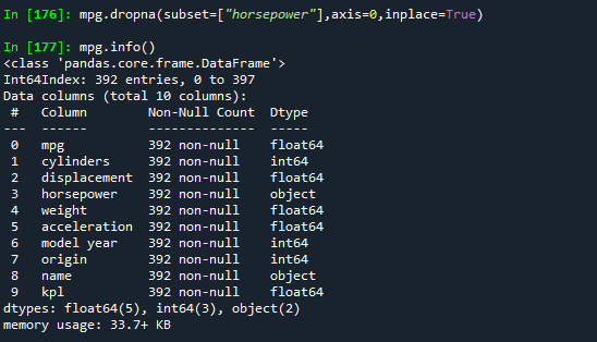mpg.dropna(subset=["horsepower"],axis=0,inplace=True)