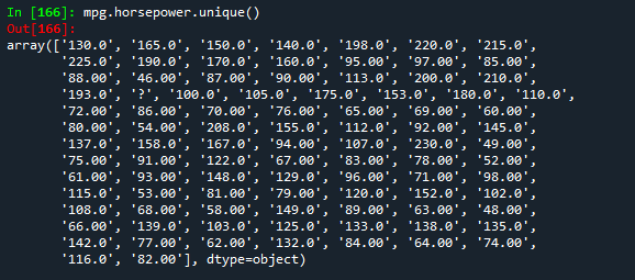 # horsepower 자료형을 실수형으로 변환하기
