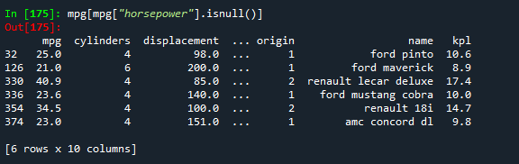 # horsepower 값이 결측값인 행을 조회하기