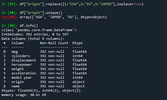 df["origin"].replace({1:"USA",2:"EU",3:"JAPEN"},inplace=True)