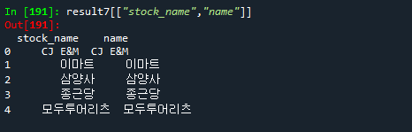 result7[["stock_name","name"]] # 같은 내용이여도 이름이 다를때는 각각 조회됨.