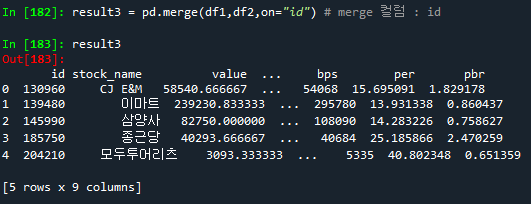result3 = pd.merge(df1,df2,on="id") # merge 컬럼 : id
