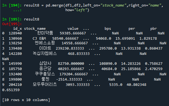 left_on = "stock_name" : 왼쪽데이터의 컬럼 중 stock_name 컬럼을 조인 컬럼으로 설정