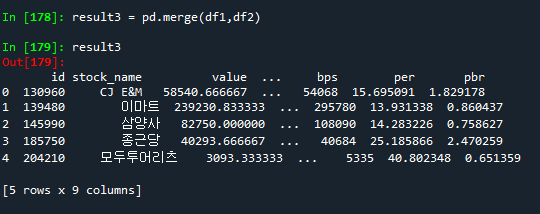 # df1의 데이터 stock_name 컬럼과 df2 데이터의 name 컬럼을 이용하여 병합하기
