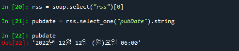 pubdate = soup.select_one("rss pubDate").string