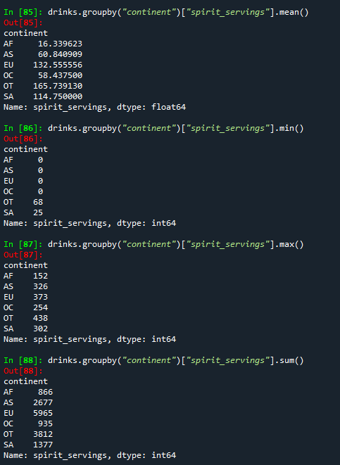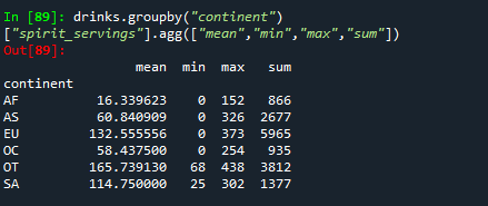drinks.groupby("continent")["spirit_servings"].agg(["mean","min","max","sum"])