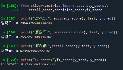 # 2. 정확도, 정밀도, 재현율, f1score 출력