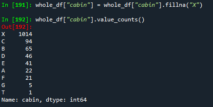 whole_df["cabin"] = whole_df["cabin"].fillna("X")