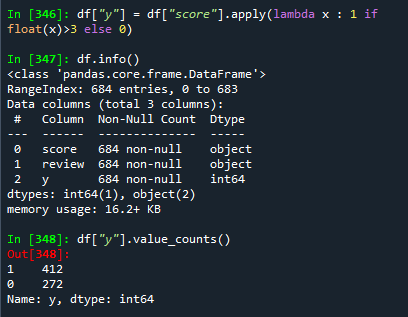 df["y"] = df["score"].apply(lambda x : 1 if float(x)>3 else 0)