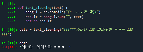 # 한글과 공백 부분만 전달해주는 함수 생성
