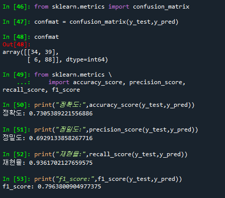 # 정확도, 정밀도, 재현율, f1-score 조회하기