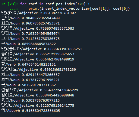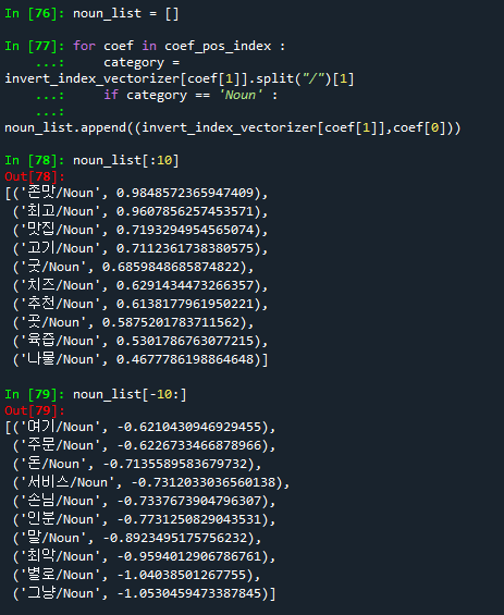 noun_list.append((invert_index_vectorizer[coef[1]],coef[0]))