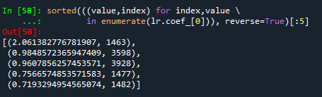 in enumerate(lr.coef_[0])), reverse=True)[:5]