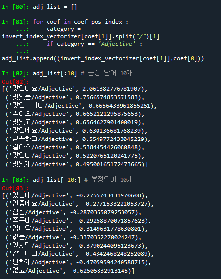 ## 형용사(Adjective) 기준으로 긍정단어 10개, 부정단어 10개의 단어를 출력하기