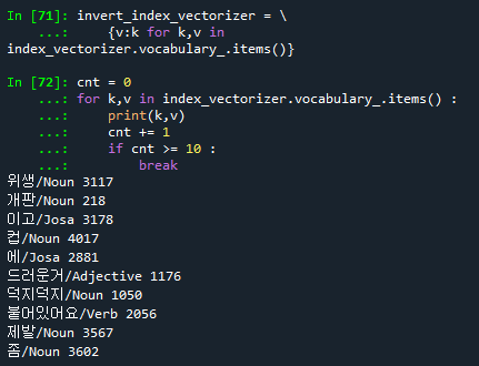 # invert_index_vectorize : {형태소인덱스 : 형태소 단어값}