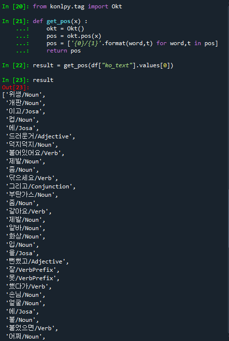 pos = okt.pos(x) # 한글을 분석하여 형태소와 품사로 분리하는 함수