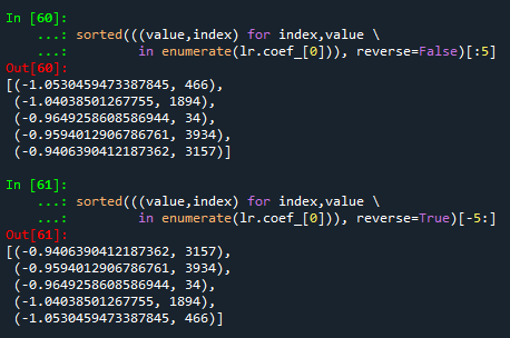 in enumerate(lr.coef_[0])), reverse=False)[:5]