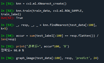 _, resp, _, _ = knn.findNearest(test_data[:100], k=5)