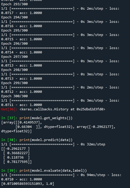 model.fit(data, label, epochs=300, verbose=0)