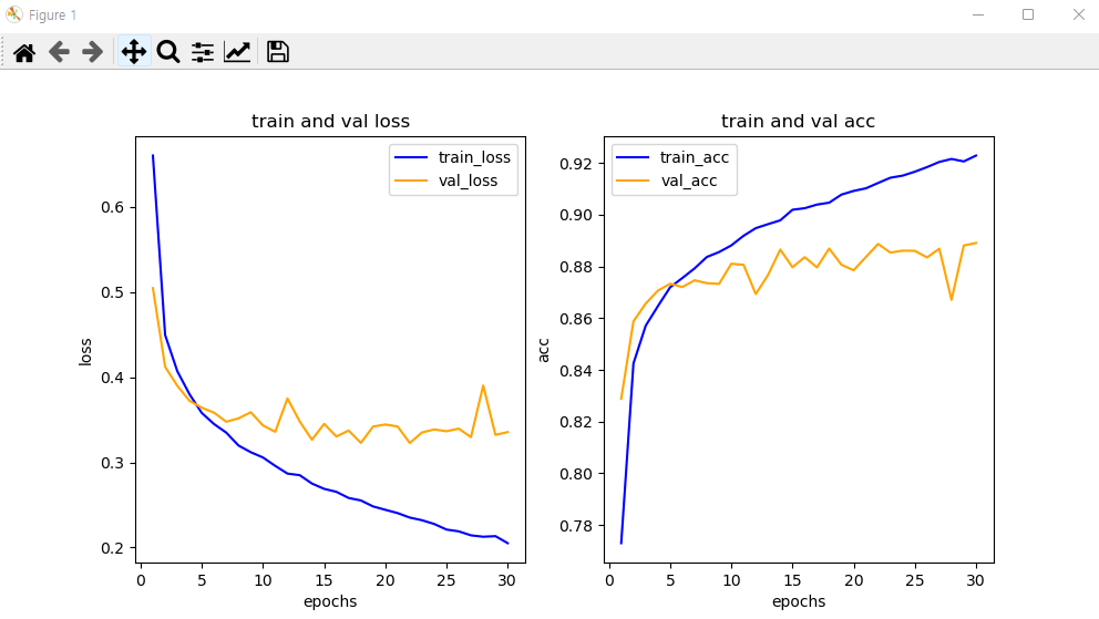 # history1 데이터로 loss, acc - 훈련데이터, 검증데이터부분을 선그래프로 출력하기