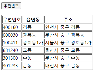 +"<tr><th>우편번호</th><th>읍면동</th><th>주소</th></tr>";