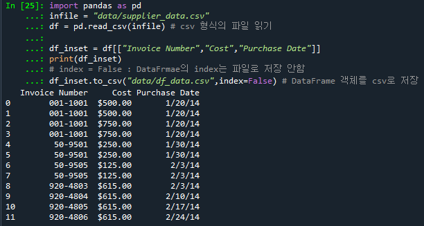 pandas를 이용하여 읽고 Invoice Number,Cost,Purchase Date