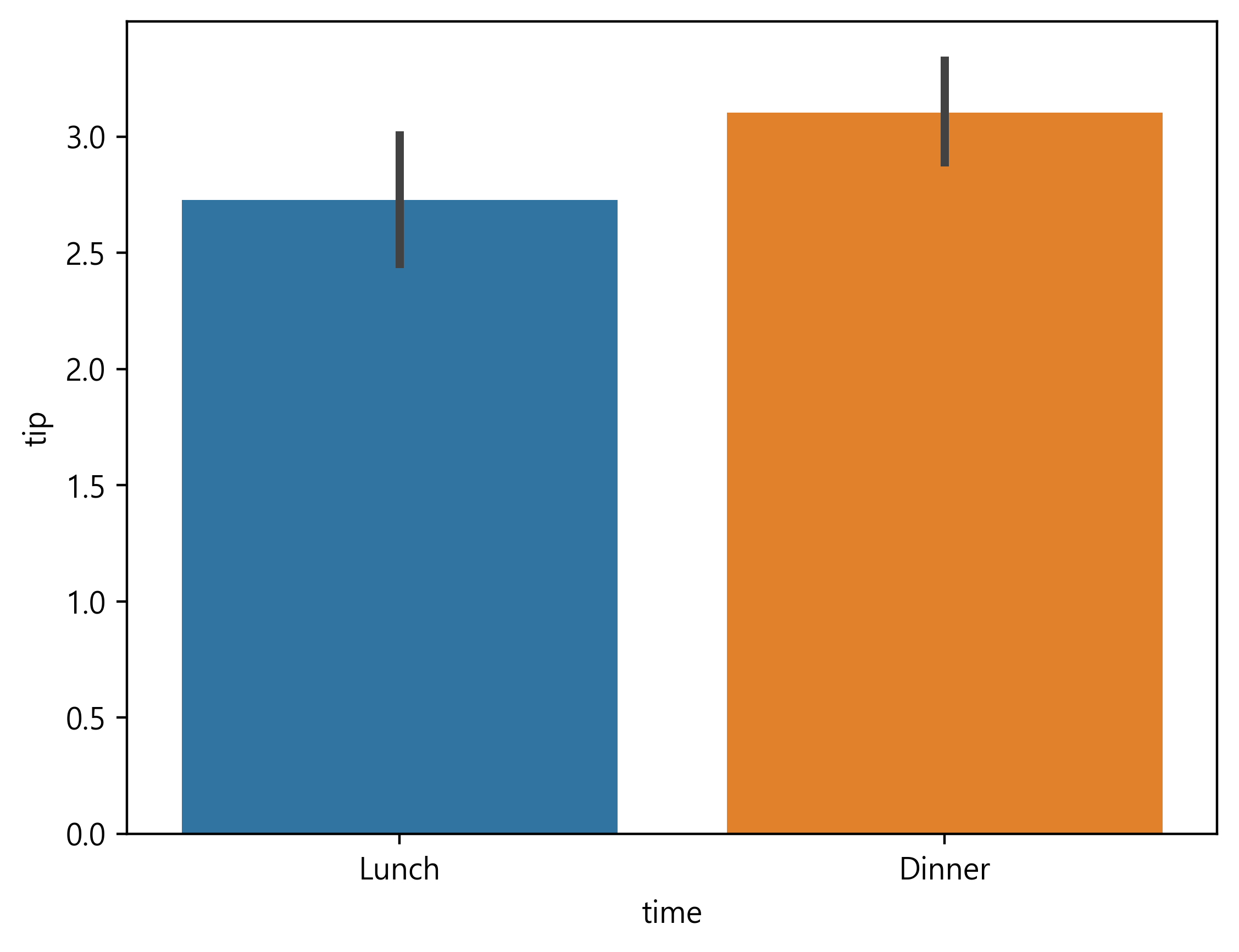 sns.barplot(x='time', y='tip', data=tips) # barplot : time별 tip의 평균 그래프