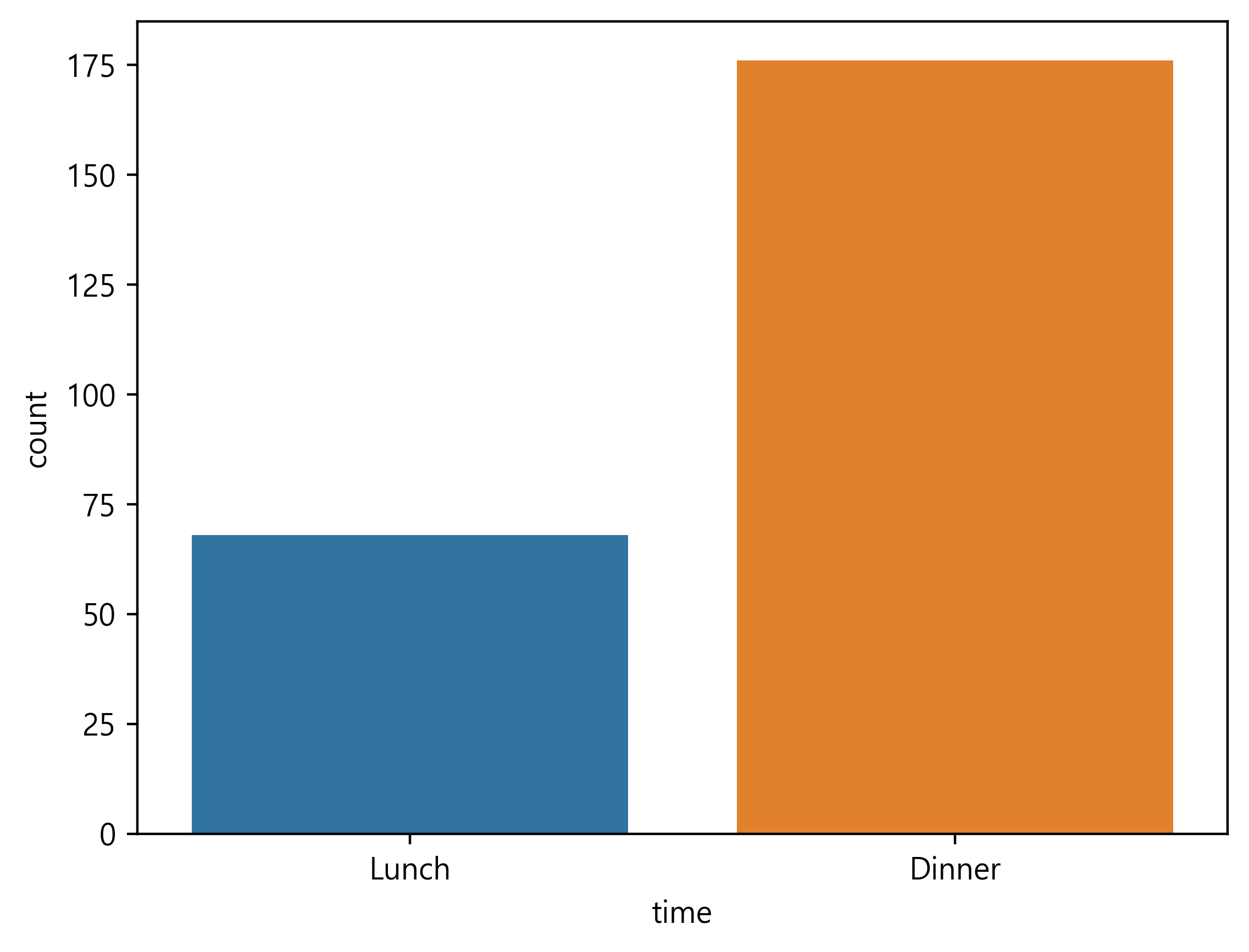 #5. tips 데이터에서 점심,저녁별 건수를 막대그래프로 작성하기