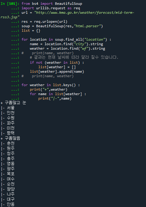 list = {} # 딕셔너리 객체. {날씨 : 도시목록}