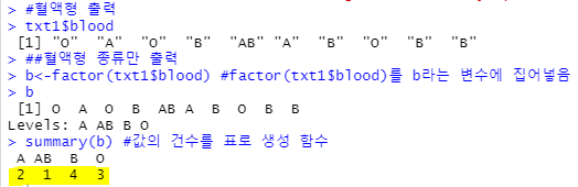 b<-factor(txt1$blood) #factor(txt1$blood)를 b라는 변수에 집어넣음
