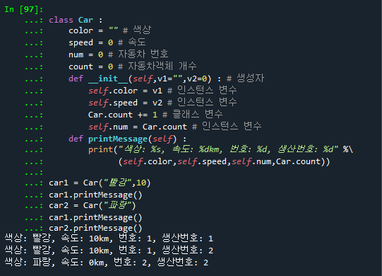 car1.printMessage() # 결과 -> 색상: 빨강, 속도: 10km, 번호: 1, 생산번호: 1