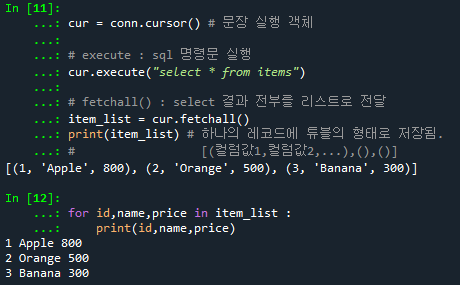 cur.execute("select * from items")