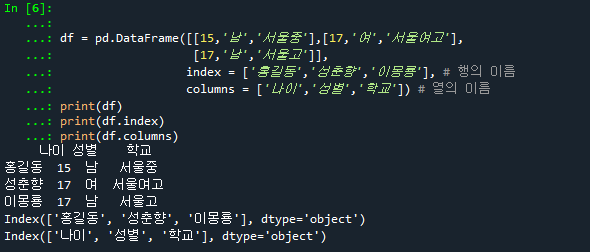 df = pd.DataFrame([[15,'남','서울중'],[17,'여','서울여고'],