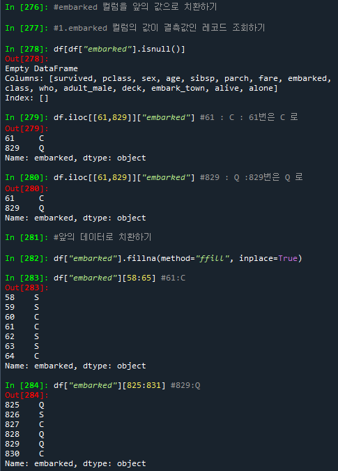 df["embark_town"].fillna(most_freq,inplace=True) # 결측값 수정